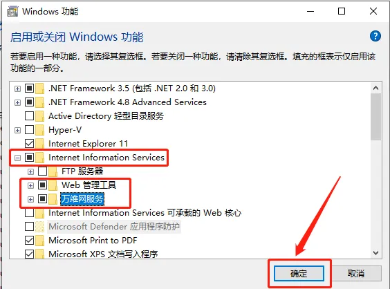 5.展开【Internet Information Service】,然后勾选【Web 管理工具】和【万维网服务】,最后点击【确定】。