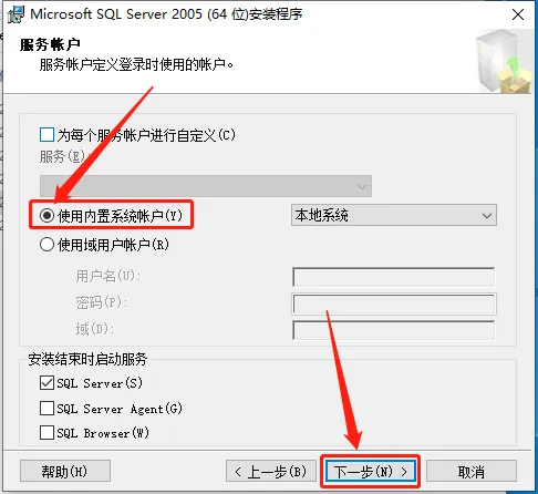 22.选择【使用内置系统账户】,然后点击【下一步】。