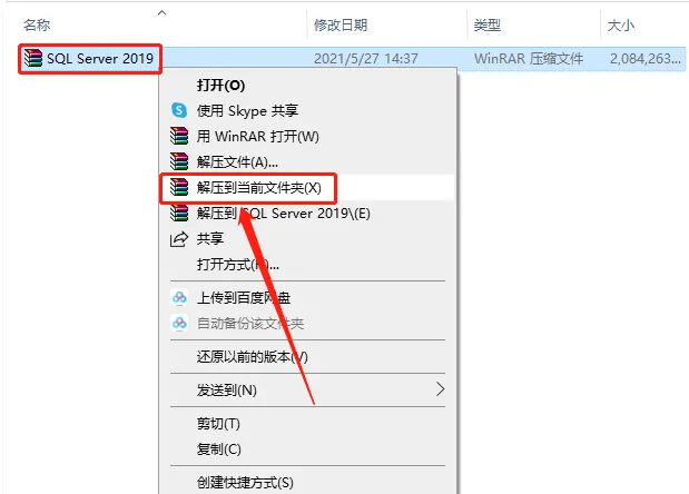 1.打开下载的SQL Server软件安装包,鼠标右击压缩包选择【解压到当前文件夹】。