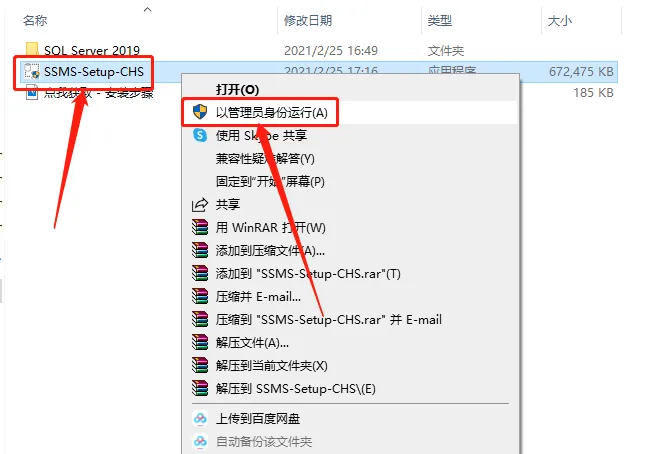 30.返回到解压的【SQL Server 2019】文件夹中,然后鼠标右击【SSMS-Setup-CHS】安装程序,选择【以管理员身份运行】。