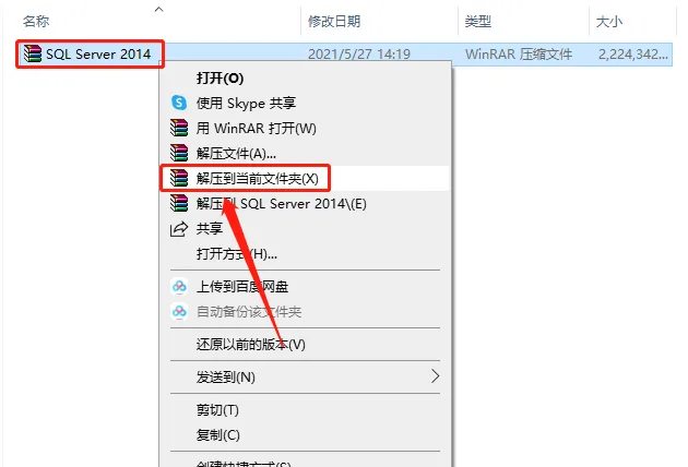 1.打开下载的SQL Server软件安装包,鼠标右击压缩包选择【解压到当前文件夹】。