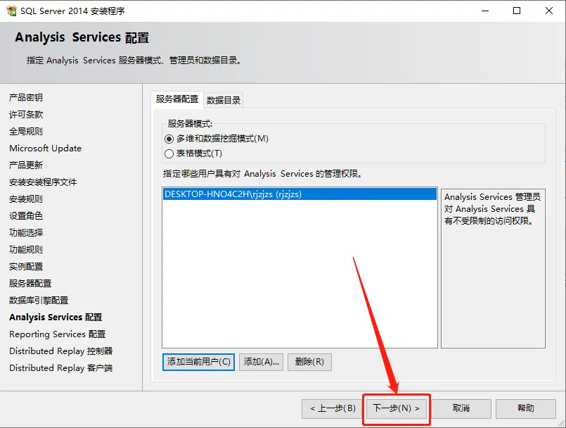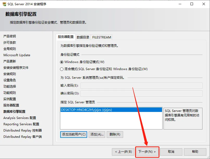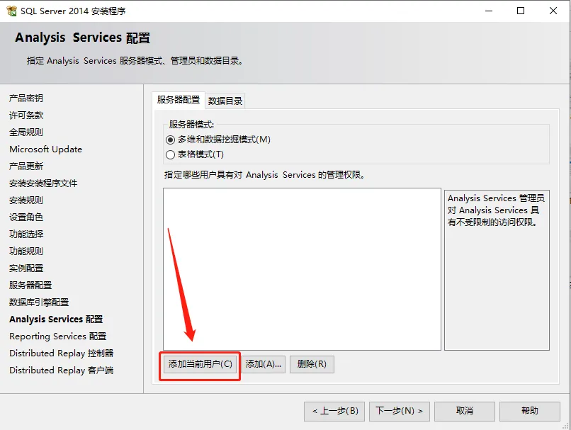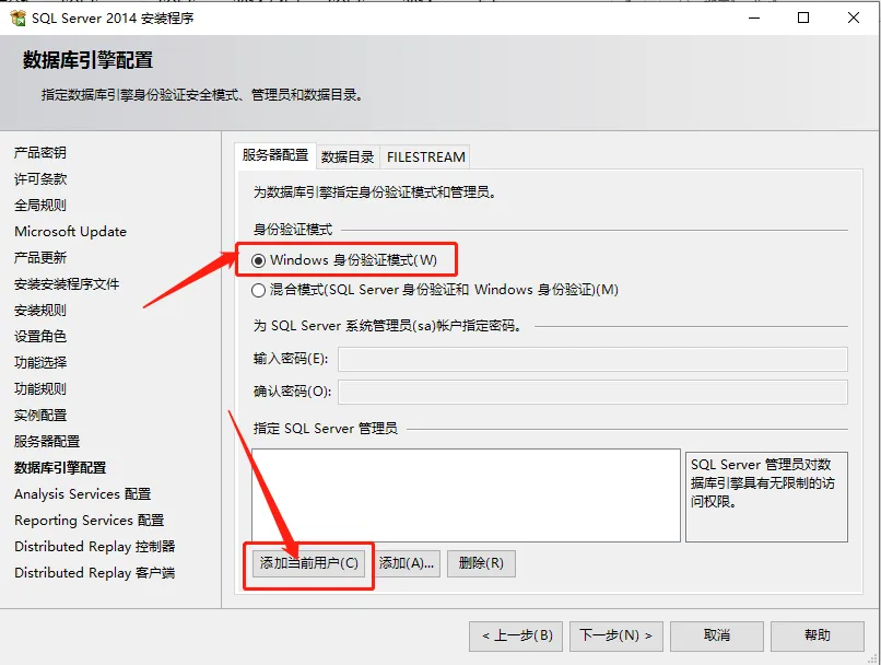 18.选择【Windows 身份验证模式】,然后点击【添加当前用户】。
