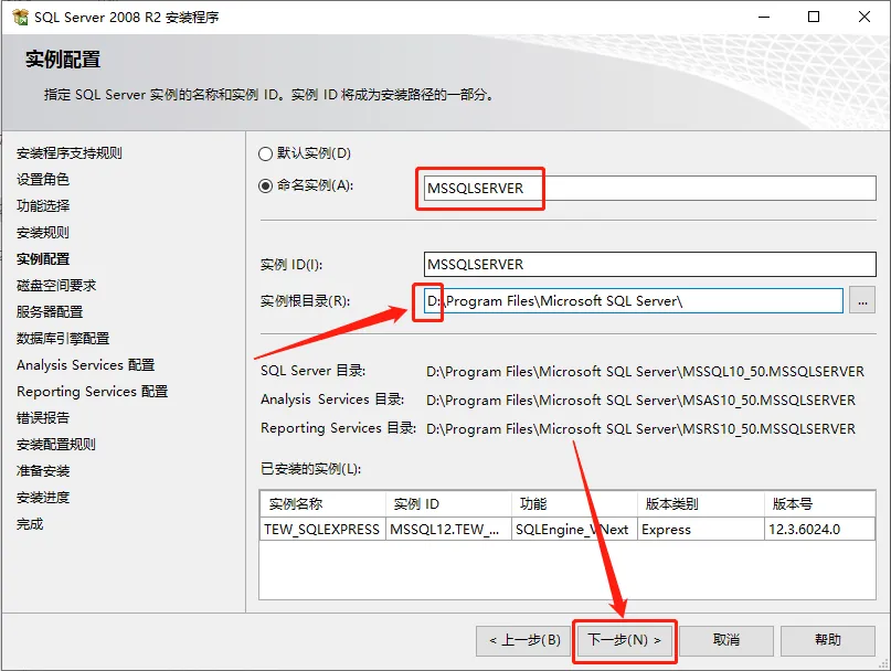 17.命名实例处输入MSSQLSERVER,将实例根目录的C改为D盘或者其它磁盘,然后点击【下一步】。