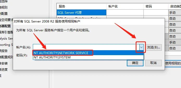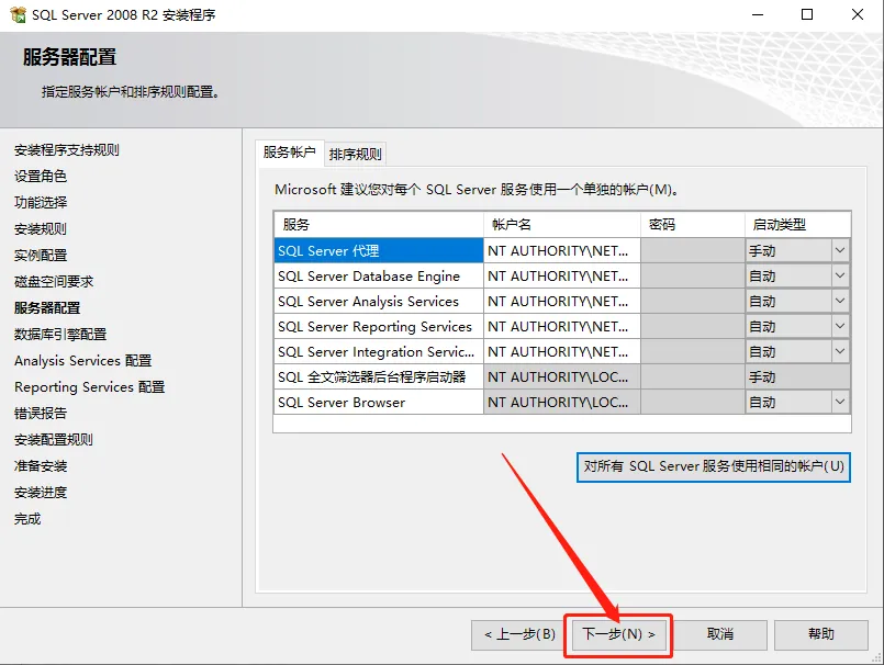 19.点击【对所有SQL Server服务使用相同的账户】。