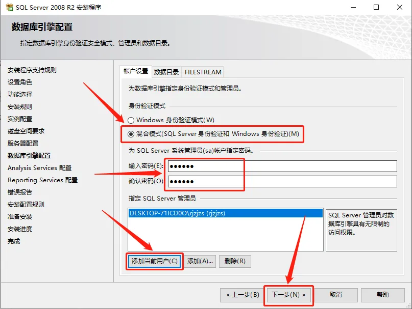 23.选择【混合模式···】,设置一个自己可以记住的密码,然后点击【添加当前用户】,最后点击【下一步】。