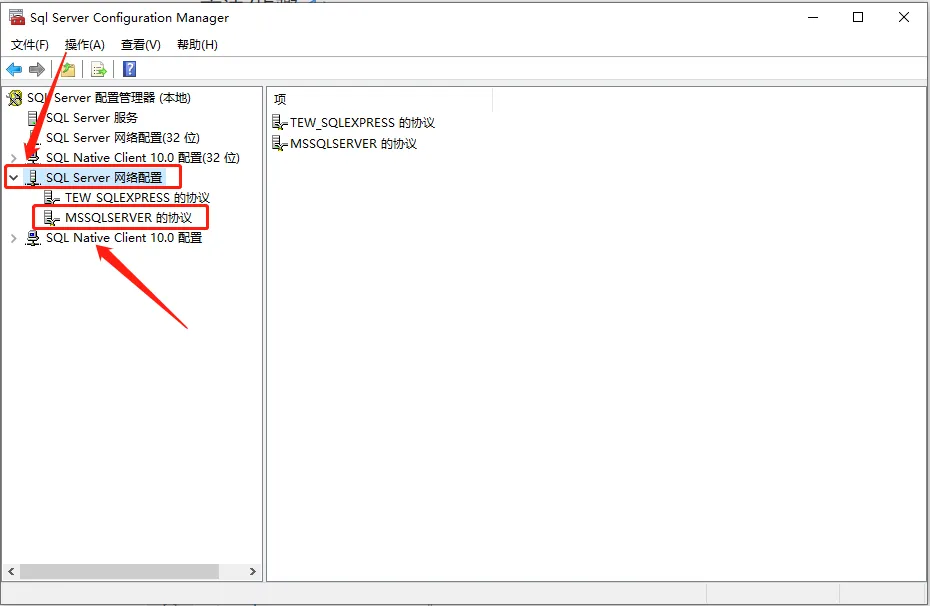 36.找到并展开【SQL Server 网络配置】,然后点击【MSSQLSERVER 的协议】。