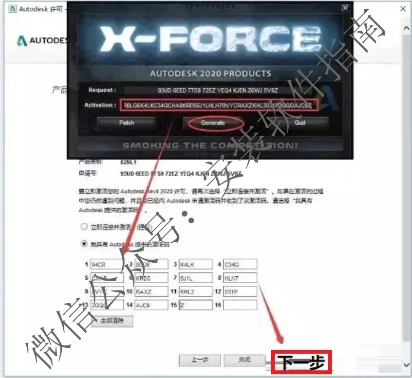 17.点“Generate”生成激活码,将得到的激活码使用快捷键Ctrl+C复制,然后使用快捷键Ctrl+V粘贴到软件的激活码输入框中,点下一步