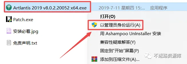 2.打开刚刚解压的文件夹,鼠标右键点击“Artlantis 2019 v8.0.2.20052 x64”选择“以管理员身份运行”