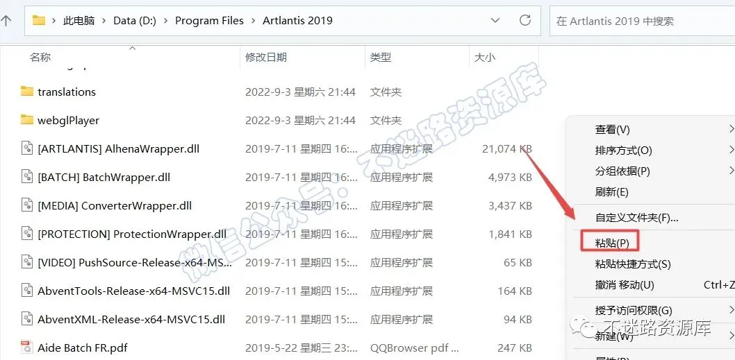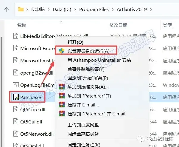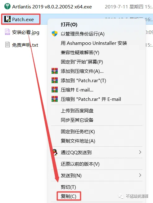 11.返回之前解压的“Artlantis 2019”文件夹,选中“Patch.exe”文件,鼠标右键点击“复制”