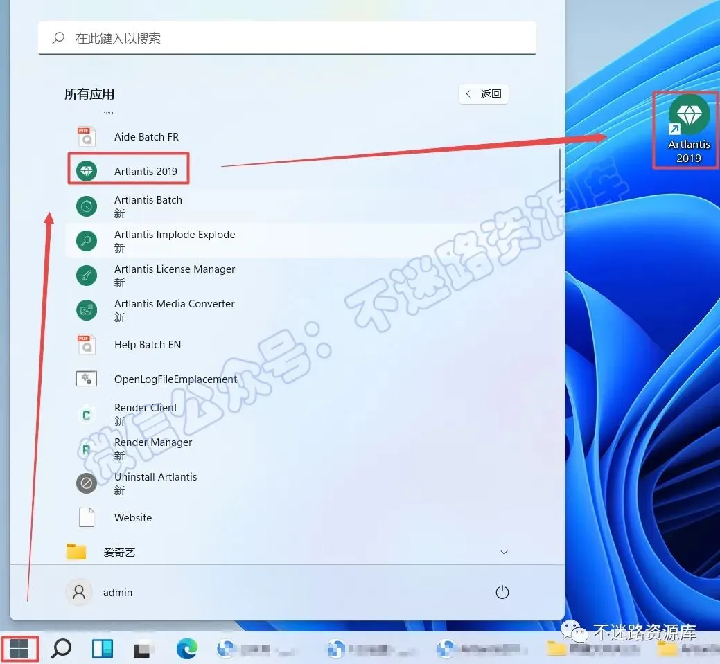 12.点击“开始“菜单栏,找到“Artlantis 2019“软件,鼠标左键拖拽到桌面上即可创建桌面快捷方式
