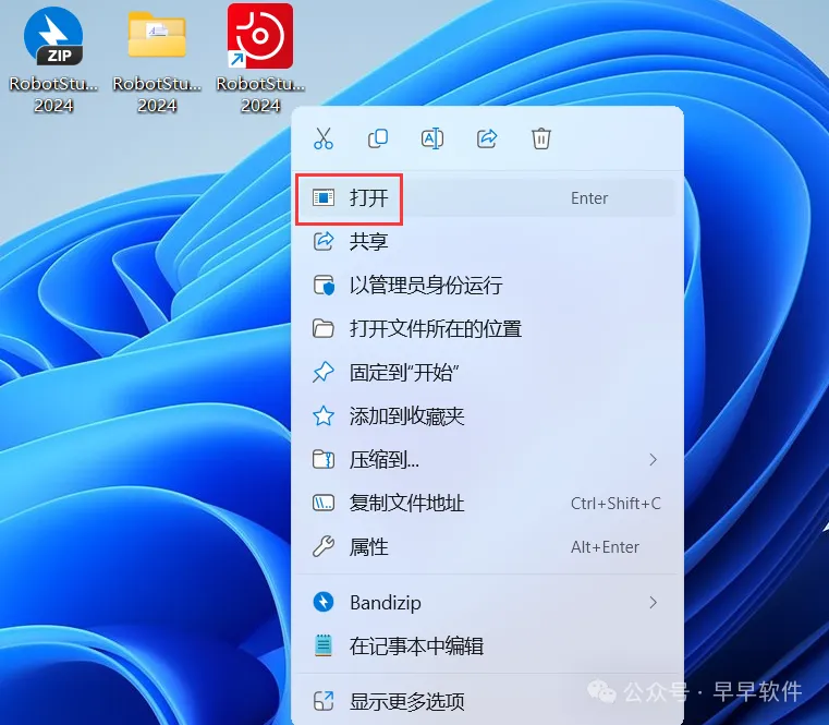 14、回到桌面,右键桌面上的【RobotStudio 2024软件图标】,点击【打开】