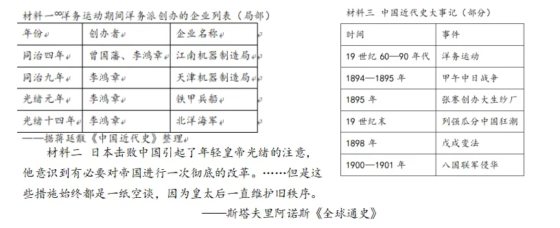 ⑤ 自拟观点(无材料 / 观点提示) | 史料:洋务运动创办企业、戊戌变法改革制度、辛亥革命推翻帝制示例观点:早期现代化探索是中国逐步走向近代的重要途径 |