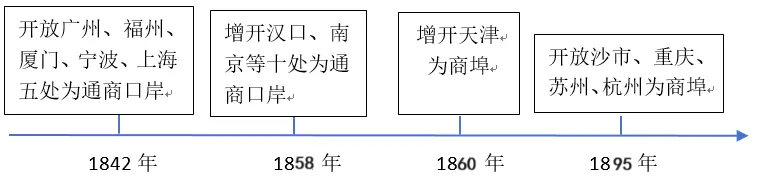 趋势:通商口岸数量不断增加(从 5 处到 10 处再到更多);开放区域从沿海地区(广州、厦门、上海等)逐步深入内地(汉口、沙市、重庆等),反映出列强对中国的经济侵略不断加深,中国半殖民地化程度逐步加剧。