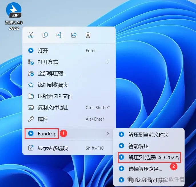 1、下载浩辰CAD 2022软件安装包到电脑上,右键选择【解压到浩辰CAD 2022\】