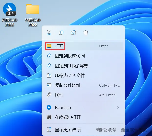 14、回到桌面,右键桌面上的【浩辰CAD 2022软件图标】,点击【打开】;注意:软件打开显示试用30天,实际可以无限制循环使用