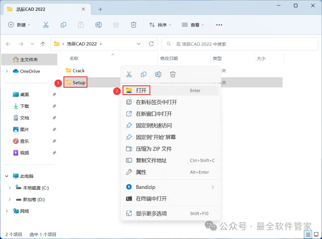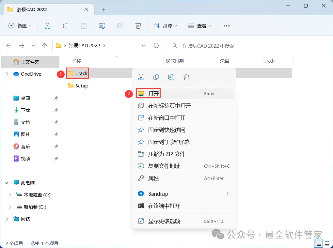 10、回到浩辰CAD 2022文件夹,找到【Crack】文件夹,右键【打开】它