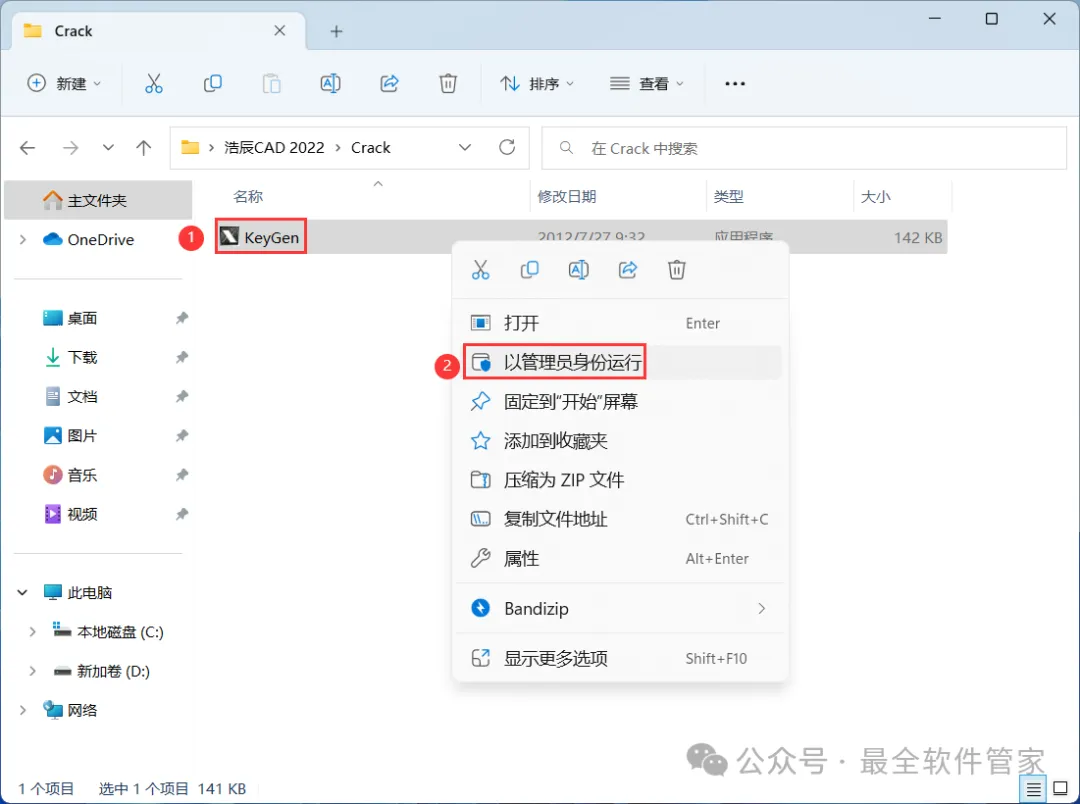 11、找到【KeyGen】应用程序,右键选择【以管理员身份运行】它