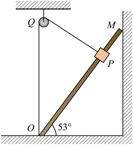 夹角且固定于O、M两点的硬直杆上套着一质量为