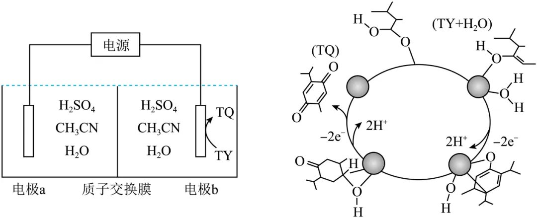 13.我国科研人员采用图示的电解池,由百里酚(TY)合成了百里醒(TQ)。电极b表面的主要反应历程见图(灰球表示电极表面催化剂),下列说法错误的是