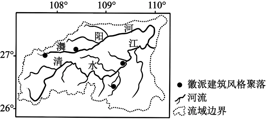 明清时期,沅江上游的清水江、㵲阳河是贵州对外联系的重要通道,沿岸贸易往来频繁,木材成为该流域经济贸易的大宗商品之一。流域内分布数处徽派建筑风格聚落,其建筑风格与本土传统木构建筑差异较大。下图示意该流域部分徽派建筑风格聚落分布。据此完成下面小题。