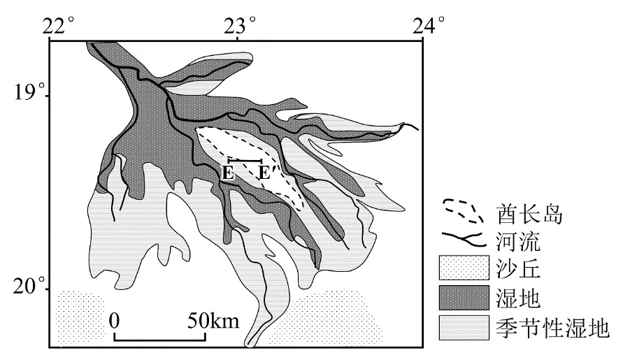 酋长岛位于非洲奥卡万戈三角洲中部,长约75km,最宽处约12km,是局部地壳抬升作用形成的岛屿。2009-2012年,该三角洲连续发生大范围洪涝灾害,酋长岛上地带性植被大面积死亡。下图示意奥卡万戈三角洲位置。据此完成下面小题。