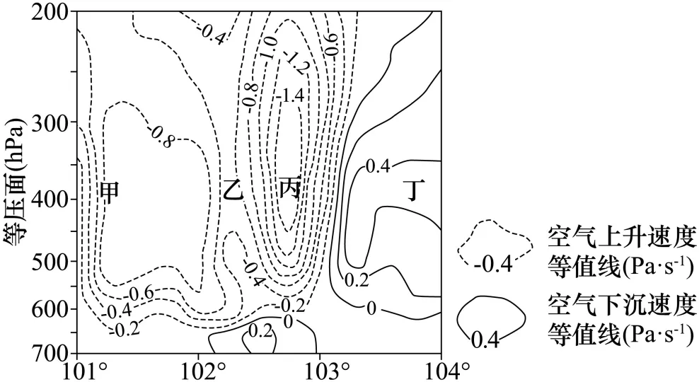 冰雹是由强对流引发的一种天气现象,具有较强的局地性和突发性。我国川西高原某年6月22日经历了一次冰雹天气。下图为当日18时沿32.8°N气流垂直速度剖面(Pa·s-1是气象部门计量空气垂直运动速度的单位)。据此完成下面小题。
