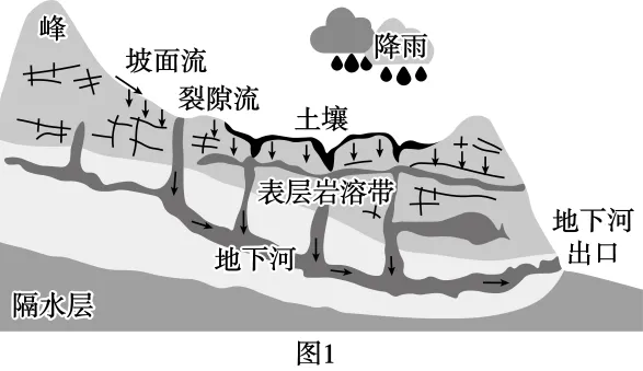 我国西南喀斯特山区地表蓄水能力通常较弱,水资源利用率较低(水资源利用率是区域用水量在水资源可利用总量中的占比)。图1示意某地喀斯特地貌剖面及降雨径流过程,图2示意该地区地下河出口处某时段实测降雨及径流响应的两种模拟曲线。