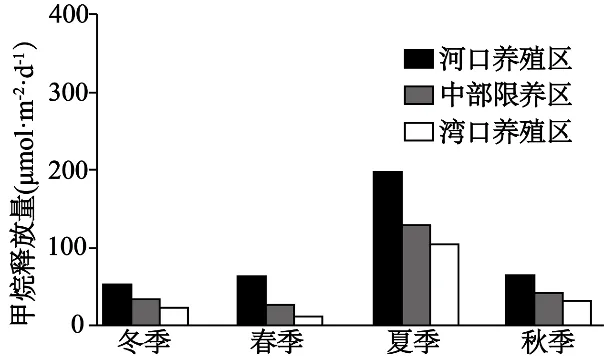 甲烷是大气中主要的温室气体之一。三沙湾是福建省重要的水产养殖区,从河口向海依次为河口养殖区、中部限养区、湾口养殖区。该区域通过水面释放的甲烷主要来源于缺氧条件下水体和沉积物中有机物的降解,其释放量主要受陆源径流输入、温度、投饵量等因素的影响。下图为2023年三沙湾表层水体甲烷释放量的时空变化。