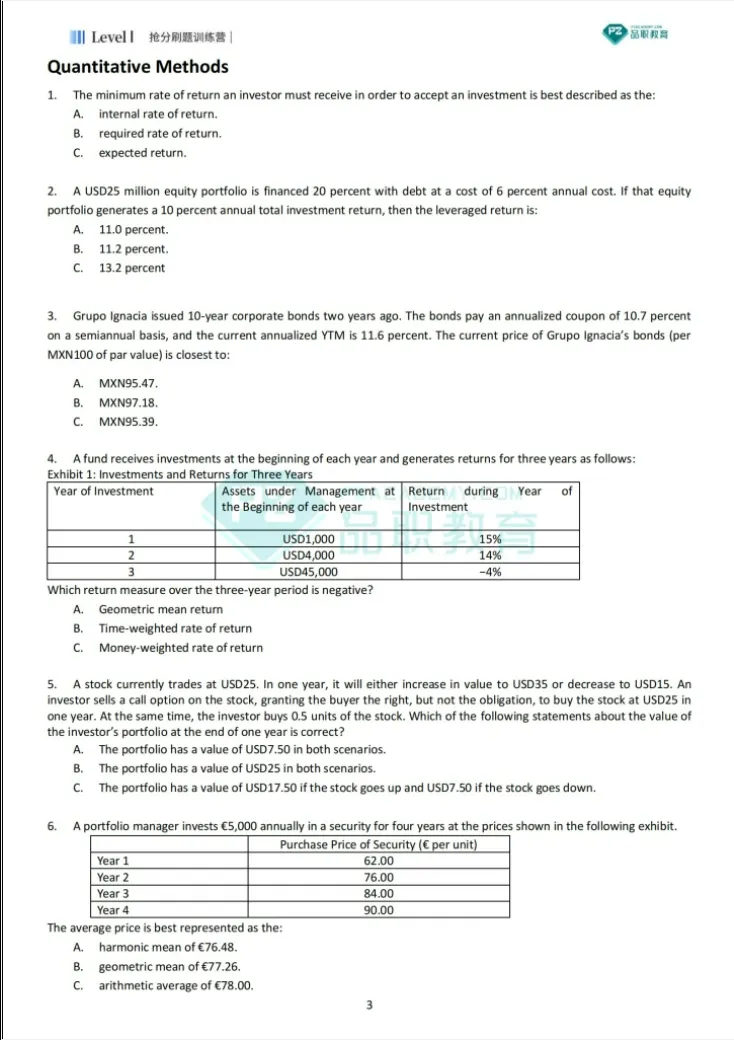 题海战术在任何一个考试中都是使用的,但是题海战术自然是有效果的,但是大家一定要注意正确的刷题方法并不是单纯去做题。我们刷题的目的,是为了加深对知识点的理解,明白每个知识点到底是以何种形式、何种套路来进行出题,这样上考场你看到题目你才能形成条件反射,知道该动用哪一块的知识点来解题,同时对每一个“踩坑点”都能做到心中有数。那想要达到这种程度,其实最主要的就是做对题,找对题源。其实CFA能做的题目不少,但是很多刚入门的小伙伴还不了解,到底该做什么题,自学的小伙伴,最核心该抓住的就是原版书课后题,这是官方发布最接近真题难度和出题风格的题目,要好好利用。