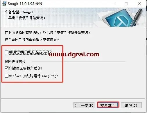 准备安装,取消【安装完成时启动 Snagit(S)】和【Windoxs 启动时运行 Snagit(E)】选项,勾选【创建桌面快捷方式(D)】,然后点击安装
