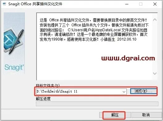 点击【浏览】更改位置至软件安装目录位置(步骤8更改的位置),然后点击解压