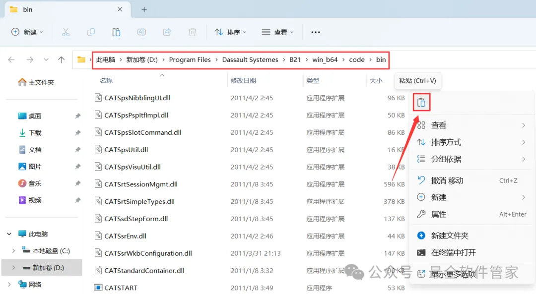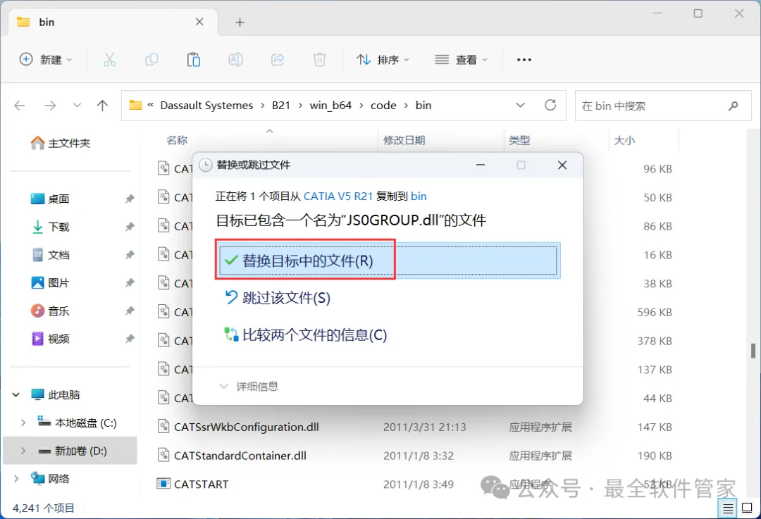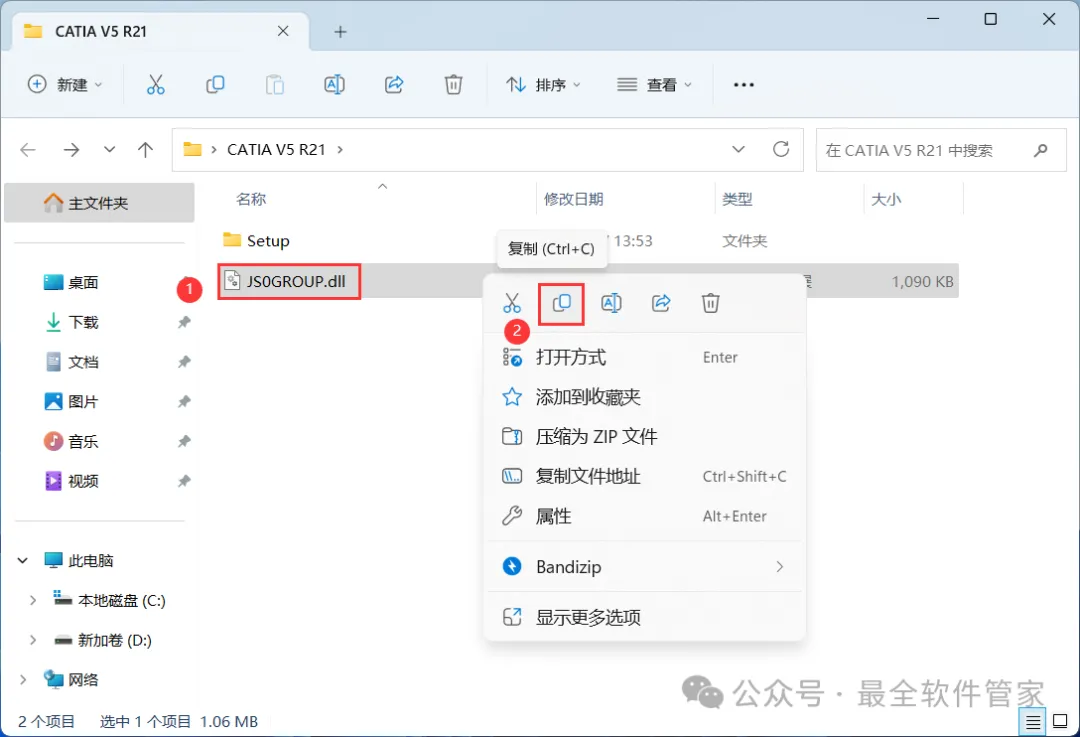 18、回到CATIA V5 R21文件夹,找到【JS0GROUP.dll】文件,再右键点击【复制按钮】
