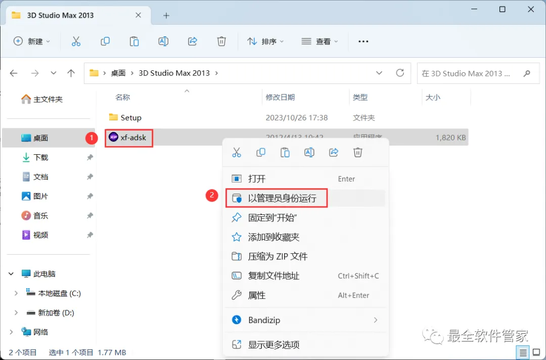 18、回到3D Studio Max 2013文件夹,找到【xf-adsk】程序,再右键选择【以管理员身份运行】它