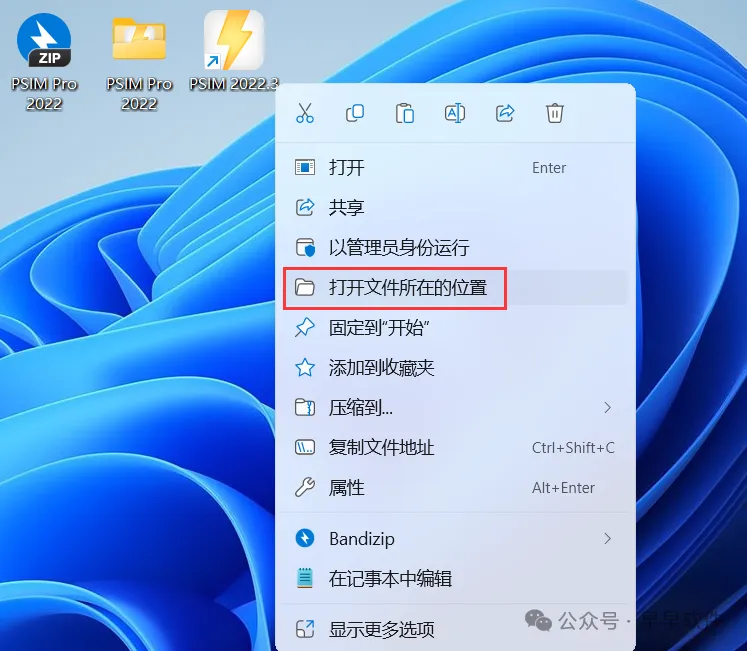 18、回到桌面,右键桌面上的【PSIM 2022.3软件图标】,点击【打开文件所在的位置】