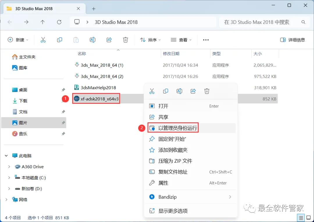 19、回到3D Studio Max 2018文件夹,找到【xf-adsk2018】程序,再右键选择【以管理员身份运行】它