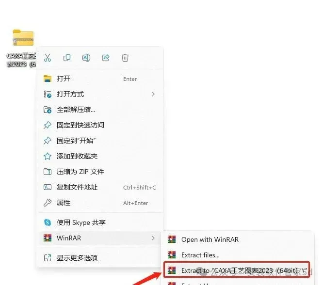 1.鼠标右击【CAXA工艺图表2023(64bit)】压缩包(win11及以上系统需先点击“显示更多选项”)选择【解压到 CAXA工艺图表2023(64bit)】。