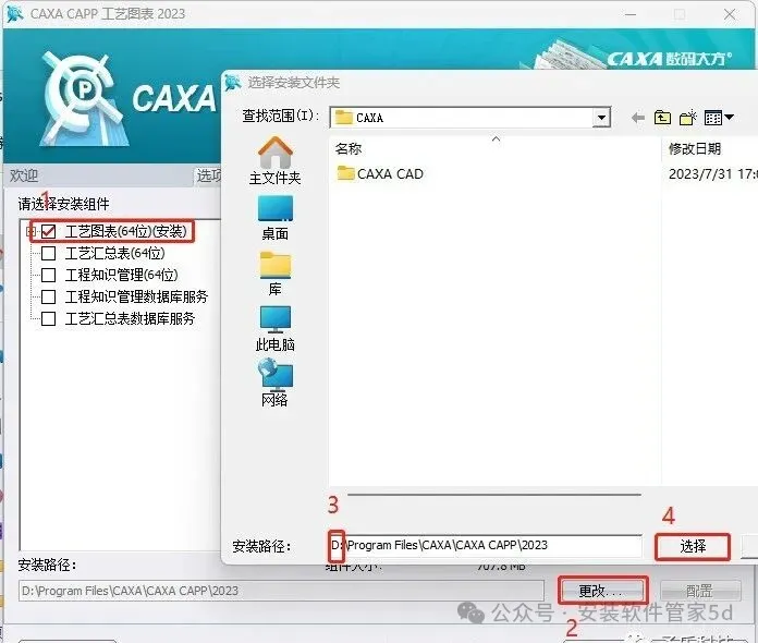 6.①勾选【工艺图表】②点击【更改】③修改路径地址中的首字符C可更改安装位置(如:将C改为D表示安装到D盘)④点击【选择】。