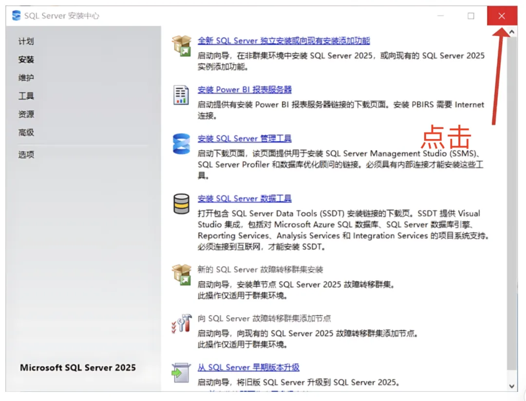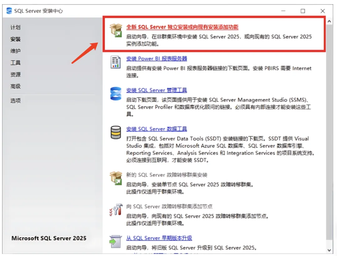 步骤4:点击左边:安装,选择:全新SQL Server独立安装或向现有安装添加功能。