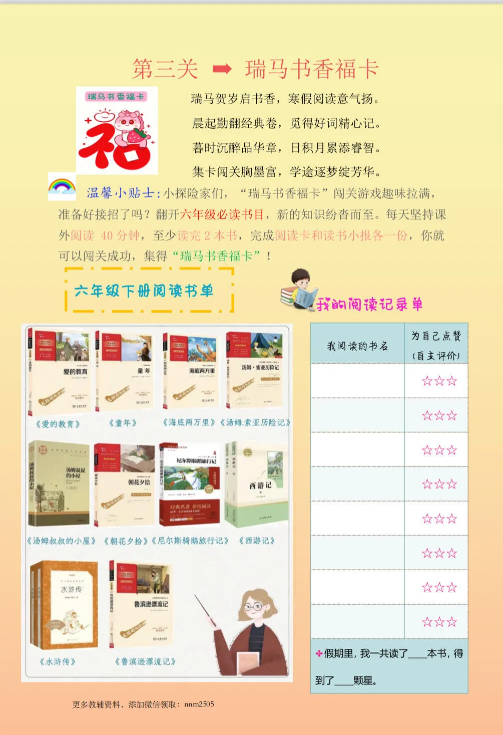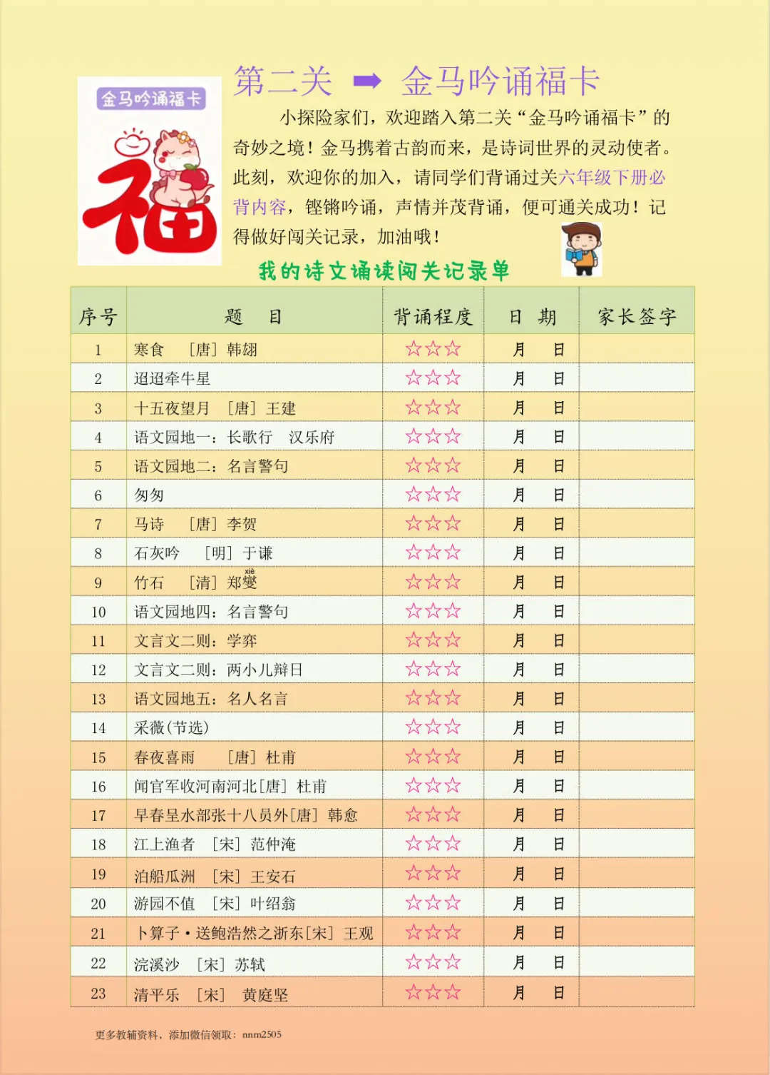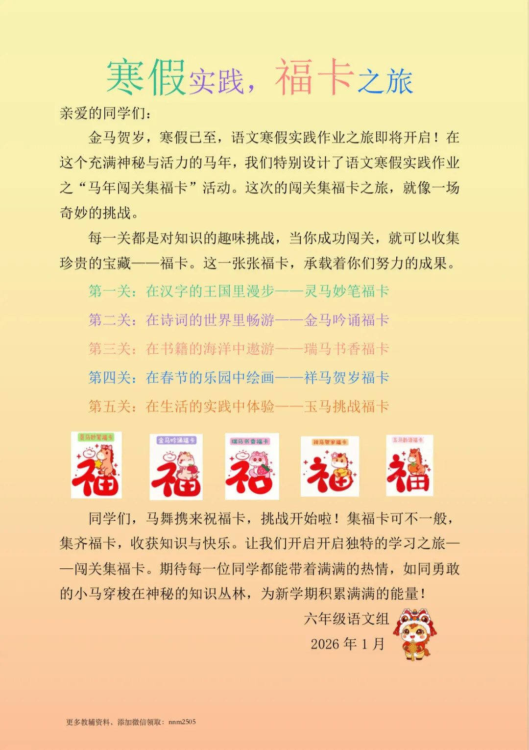🐴2026六年级寒假特色作业上线啦!以“金马贺岁 闯关集卡”为主题,设计汉字、诗词、阅读等五大福卡闯关任务,将知识学习与马年新春趣味结合。孩子在闯关集卡的过程中,既能巩固语文知识,又能收获满满的成就感,让寒假学习变得生动又有趣~