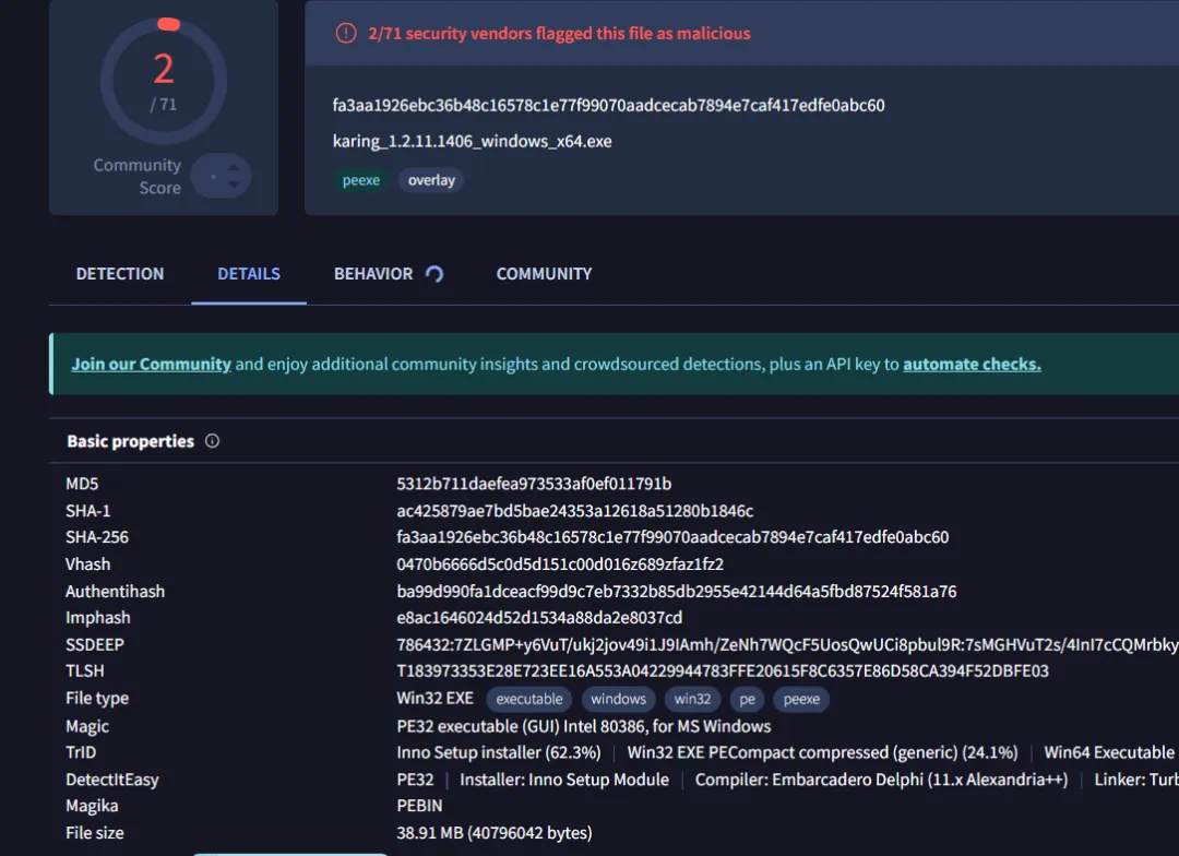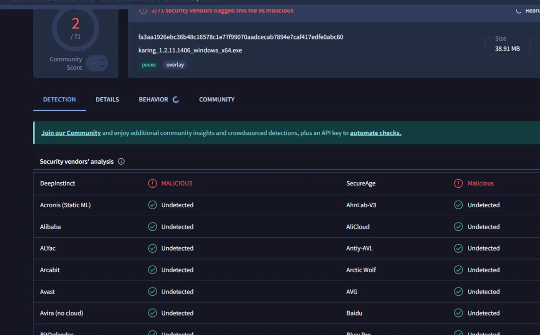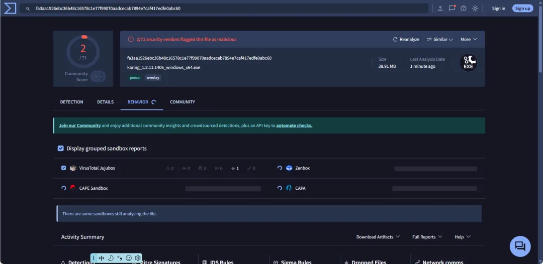 大家从设备官方的应用商店安装应用程序的时候,可能就没有怎么去注意安全性的问题了,但是如果手动从网站下载了安装程序,不管是Windows安装程序还是安卓安装程序或者是iOS的testflight测试安装包,最好都要检查一下是否安全。经典的检查方法可能就是用杀毒软件扫描一下,这可能不够。当然高手们有空的话,可能自己用sandbox-ie plus这样的沙箱软件去分析, 但那样太费时费力。所以我们这个时候就可以使用virustotal网站进行在线扫描,而且访问它不需要科学技术。它既可以使用几十个杀毒软件对你上传的文件进行扫描。如果你下载的文件是有公网直链的,你都可以不用下载,直接把链接给它就可以了。它也可以进行沙箱行为分析:比如这个应用安装过程中访问了什么网站,修改了注册表,是否有持久化攻击意图等。 只是它的沙箱有点慢,只有它自家的jujubox快一点,其它的几个老半天也出不来。不过你可以晚点再来看,关了浏览器也没有关系,下次可以再传一次,或者直接用哈希ID来查询结果。
