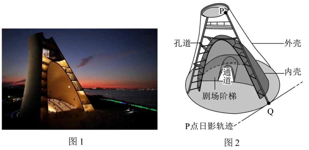 时光塔(图1)坐落在山东烟台海边(约37.5°N),集图书馆、半露天剧场等功能于一体。其独特的外形和内外壳多孔道相连的结构,既营造了光影效果,又实现了“与自然共呼吸”的设计理念。图2为时光塔结构示意图。在特定日期,该建筑外壳边缘P点的日影轨迹呈条直线,且Q点为P点的正午日影。据此完成下面小题。