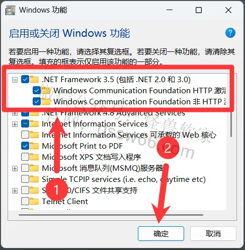 05,勾选“.NET Framework 3.5”,点击“确定”