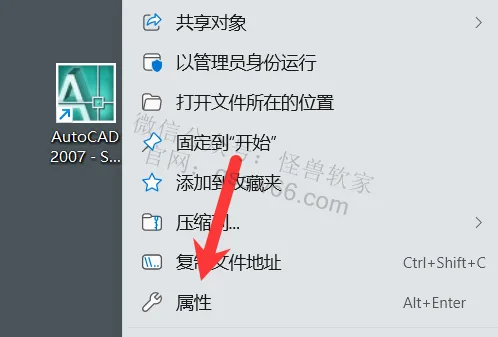 23,在桌面找到并选中AutoCAD软件图标,点击鼠标右键,点击“属性”