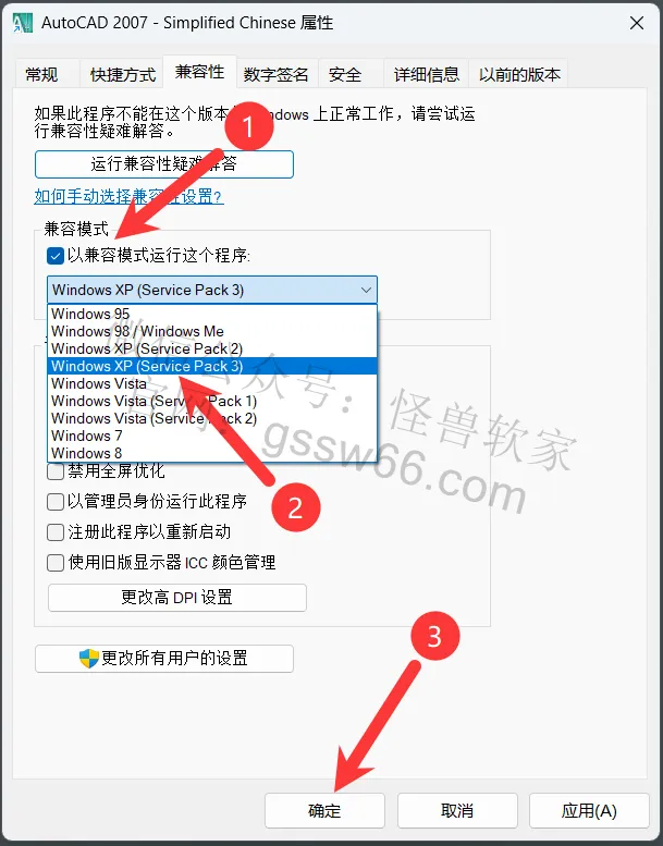 25,勾选“以兼容模式运行”,选择“XP (Serviece Pack 3)”,点击“确定”