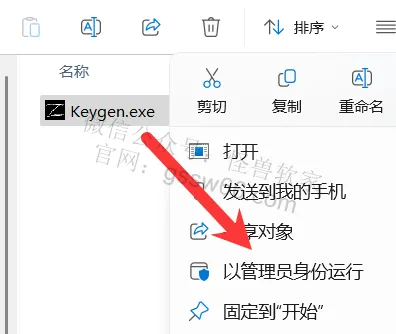 33,找到并选中“Keygen.exe”程序,点击鼠标右键,点击“以管理员身份运行”
