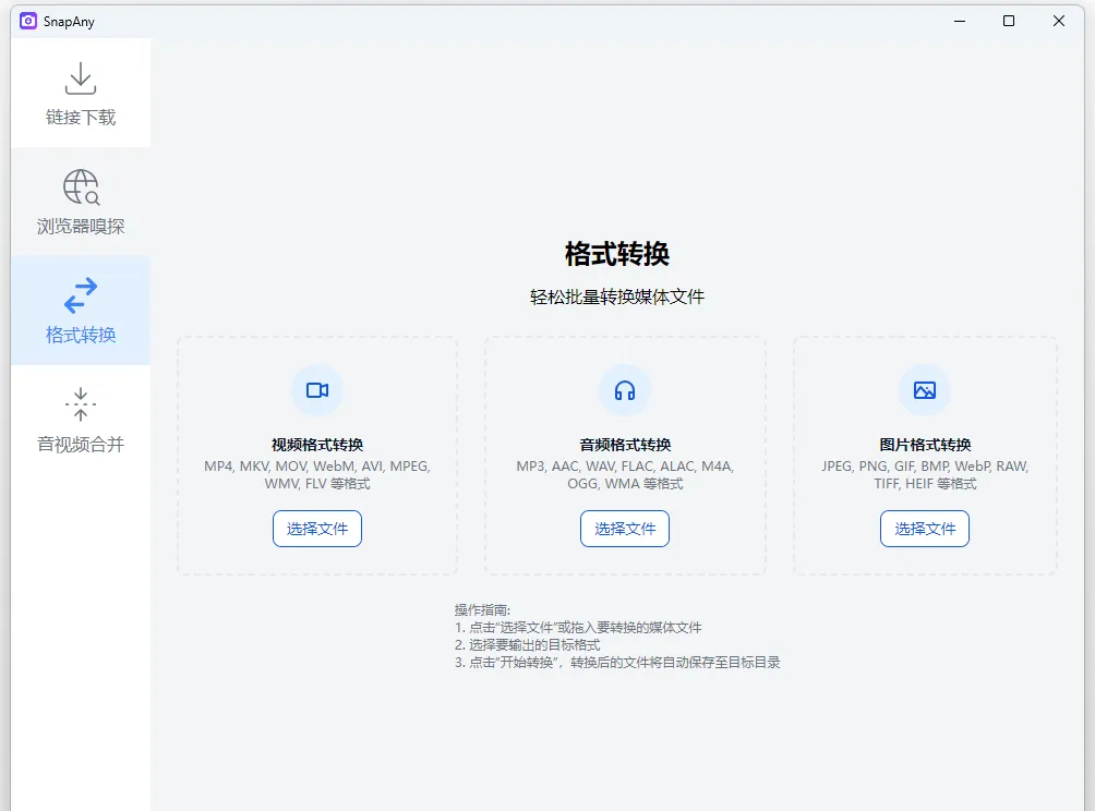 格式转换:视频(MP4/MKV/MOV等)、音频(MP3/WAV/FLAC等)、图片(JPG/PNG/GIF等)批量转换。
