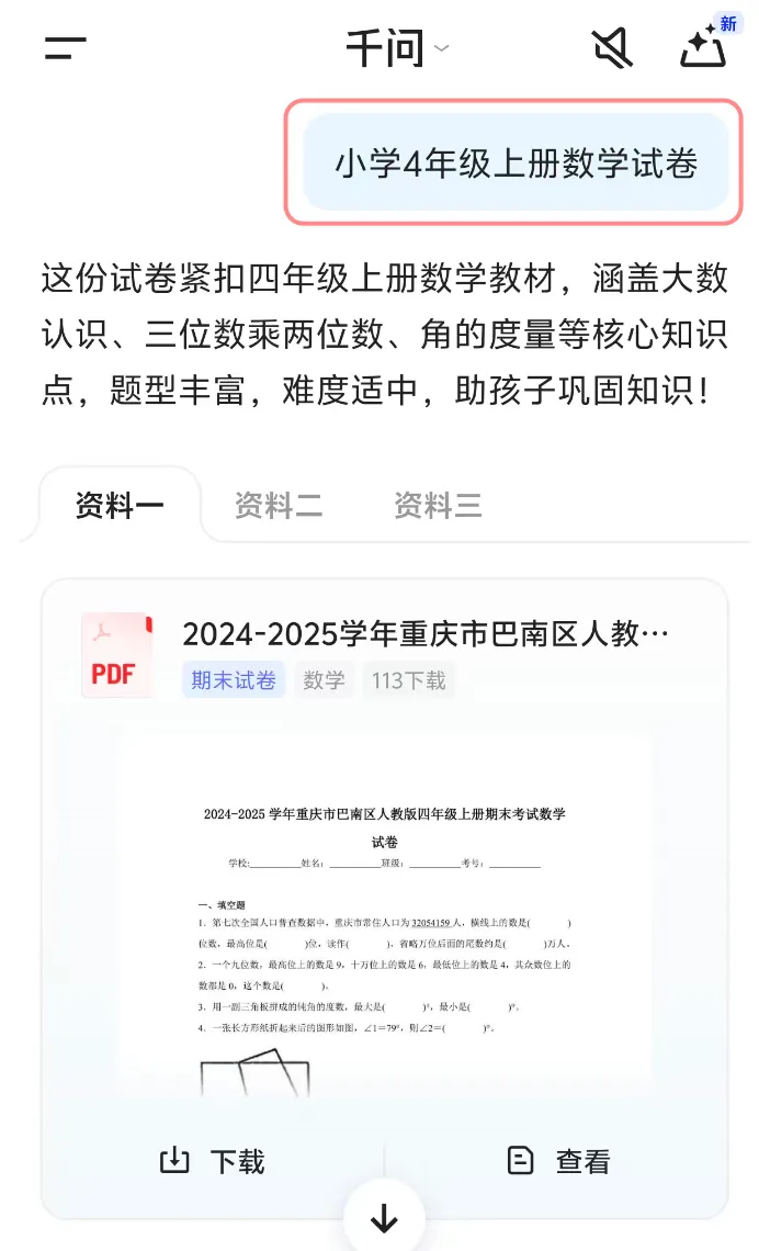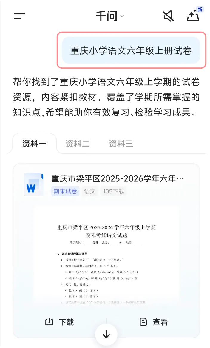 因为千问APP上线超级海量的试题库,对话就能精准搜索想要的题库(试卷),直接把传统的试题下载平台拍死在了沙滩上。
