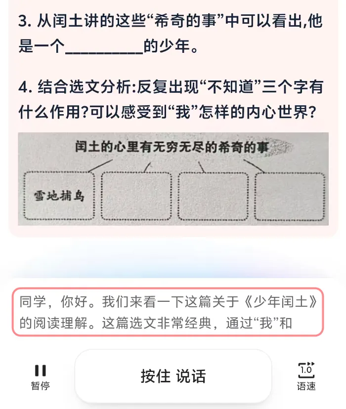 在对话框的上方,有一个“拍题答疑”专项入口,从这儿拍一张题目发给AI,看看会发生什么。