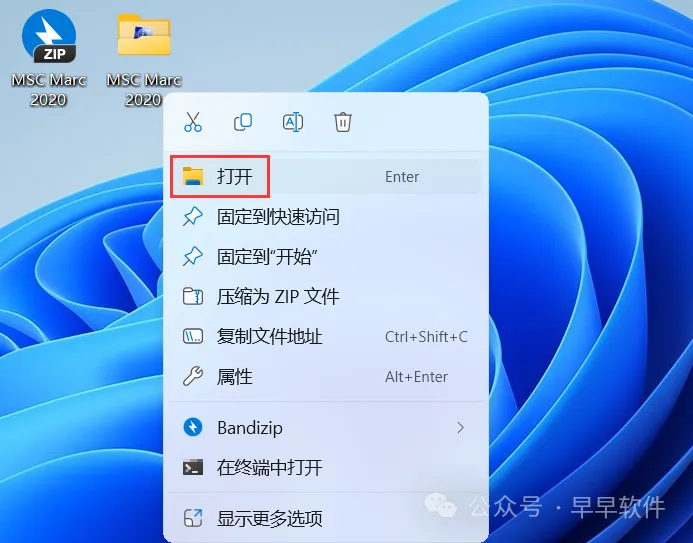 41、回到桌面,右键桌面上的【MSC Marc 2020软件图标】,点击【打开】