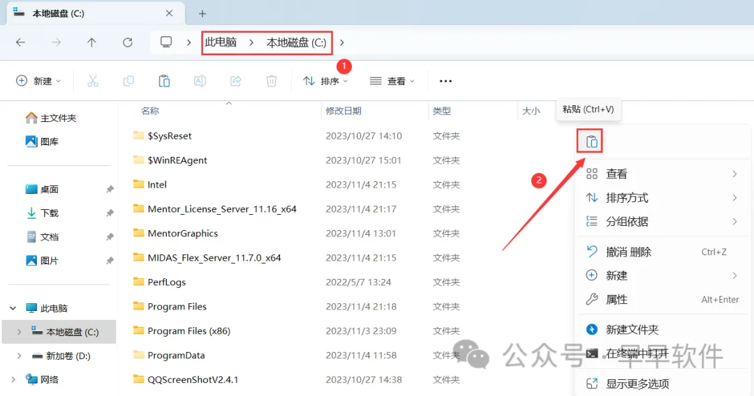 4、打开本地C盘,再右键文件夹的空白处,点击【粘贴按钮】